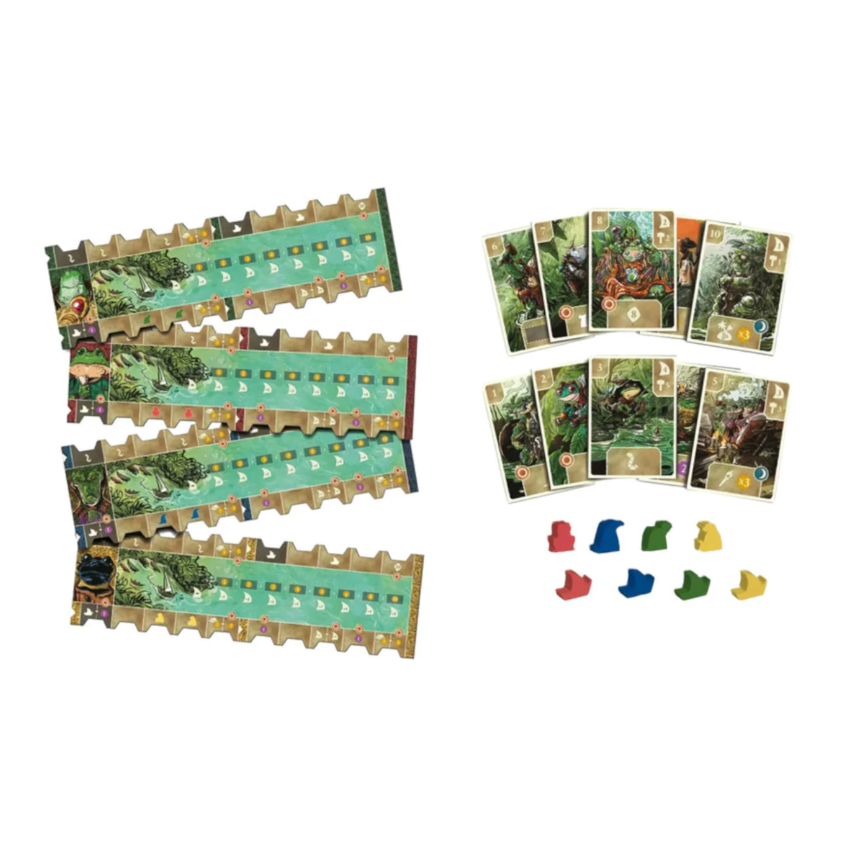You take actions by moving your boats across the swamp, and these actions include fishing, trading with other clans, exploring abandoned temples in Feya, and building new settlements that will enhance your clan's abilities. Some actions don't require moving through the swamp, such as improving your navigation, which increases your boat speed; hosting festivals where each clan contributes fish to earn victory points; or building new cult spaces that bring prestige to the small islands that form in the swamp.